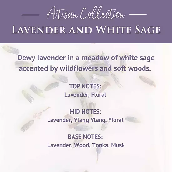 - Lavendar & White Sage fragrance notes: lavender, floral, lavender, ylang ylang, floral, lavender, wood, tonka, musk