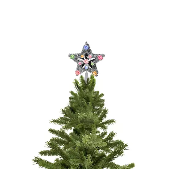 This classic star of Bethlehem screams nostalgia with its gold tinsel border and sparkly appearance. Multicolor lights complete the vintage feel and offer an exquisite look to your trees or wreaths. It is the perfect complement to your Christmas decor this season. Product Features: Color: multicolor bulbs / green wire. Number of bulbs: 11. Bulb size: mini. 24 lead cord. One-sided design. Additional Product Features: UL certified and approved for indoor use only. Comes with replacement bulbs spare fuse and cone to attach to tree. Contains 1 plug with end connector which allows you to stack multiple lighted items together (not to exceed 210 watts). 120 volts 60 hertz .08 amps 9.6 watts. Dimensions: 9H x 8.5W x 2D. Material(s): plastic/tinsel/glass bulbs/wire