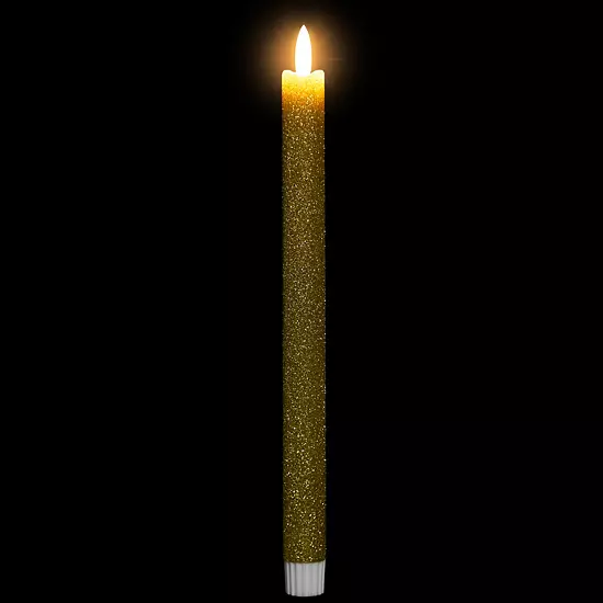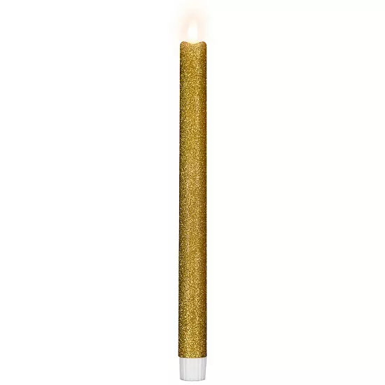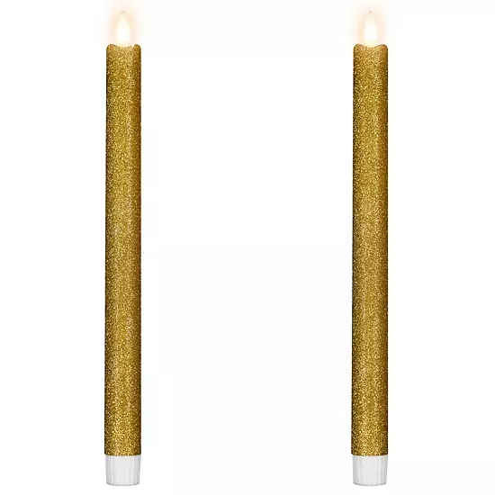 Add this battery-operated candle set to your holiday decor. The candles are pillars gold embellished with glitter looks like real candles that flicker with 3D lighting. You can Place them inside lanterns for a modern twist on classic style or use them with wall sconces to create dramatic accent pieces this Christmas. Features: Set of 2 gold flameless pillar candles. Candle is coated in a shiny gold glitter. Glows with a warm white LED light. On/off push in button at the bottom. Made from real wax with a flameless tip. Requires 2 ‘AAA’ batteries – not included. Recommended for indoor use only. Dimensions: 11 high x 1 diameter. Materials: wax/plastic
