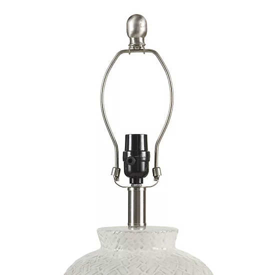 The off-white ceramic Emilia table lamp, showcases a classic and sophisticated silhouette that adds a touch of elegance to any home décor.
