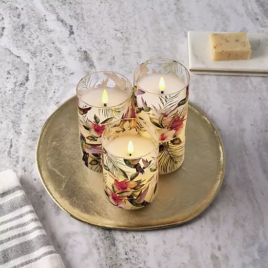 Safely create warm ambient lighting with this Mikasa 3-pc. LED Waxed Filled Glass Votive Candle Set.