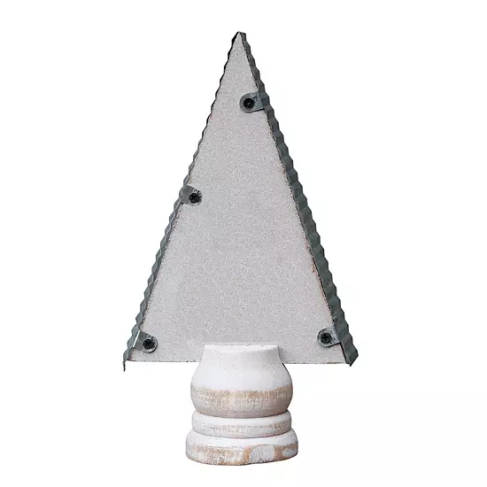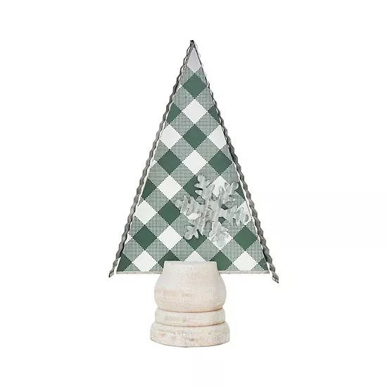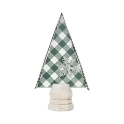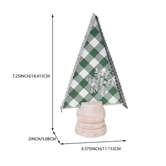 - Material: This Christmas tree shape table decor is crated of solid wood base, corrugated galvanized metal edge, cutout galvanized metal snowflake and paper with plaid pattern.