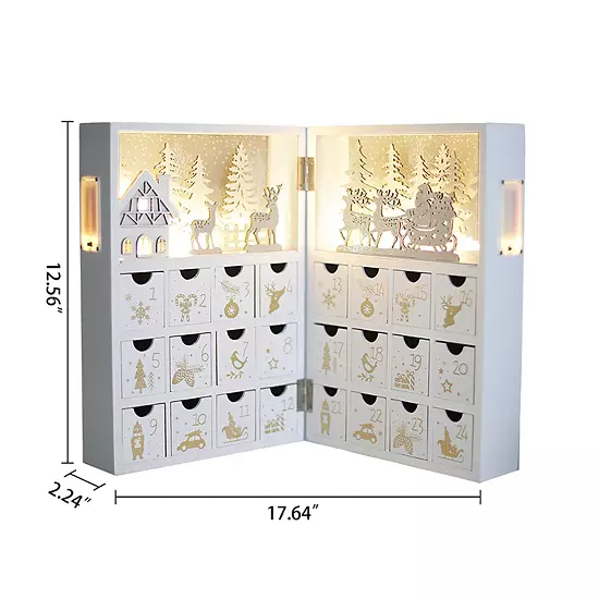 Merry Christmas! Our Advent Calendars are a perfect way to countdown to Christmas this year! We believe everyone should have their dream Christmas. Our wooden Advent Calendar for Christmas decorations help you create your dream Christmas. Waiting for Christmas is much easier and more exciting. This fantastic white advent calendar book made of wood has 24 drawers. Inside of the book there are led lights. When the Led lights turn on, warm lights are emitted from the house. This product is designed from high-quality wood. The smooth shape of the product and the delicate details all reflect our ingenuity as a professional wooden advent calendar seller for over 20 years. The structure of square frame can stand on desktop or window sill, full of Christmas atmosphere immediately. Each doors can be filled with candy, or a small gift, or a clue of bigger gift so that a child can find them out with fun. From 1st of December to the 24th, 2024, a child with proper behavior, will be awarded by parents or grandparents. When a child opens the door, it would be a great pleasure to find awards. Put it on your kitchen counter, in your bedroom or home office, or bring it to work to dress up your desk for the holidays.