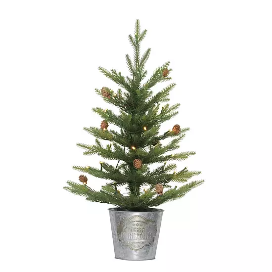 - Bring the holiday spirit into your home with the PULEO INTERNATIONAL 2′ Table Top Artificial Christmas Tree. This pre-lit artificial tree features green branches, mini pine cones, and 35 warm white LED lights to brighten your home for a dazzling Christmas display. With life-like pine needles and a realistic appearance, this table top tree is sure to add warmth to any room or space for years to come. The tree is battery operated and requires 3 AAA batteries (batteries not included). The included sturdy metal pot stand will safely and steadily support your tree and decorations. Constructed from flame-retardant and non-allergenic materials, this tree provides a safer alternative to real trees. The Table Top Tree with 35 lights measures 24 tall x 16 in diameter and weighs 3.3 lbs., allowing for easy placement and versatile Christmas decorating anywhere in your home.