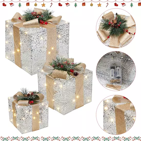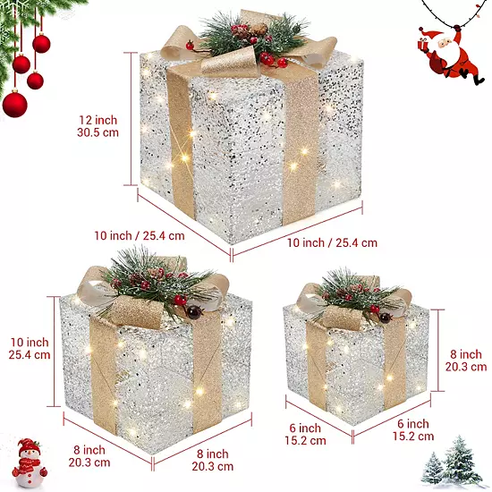 - Beautiful Lighted Gift Boxes: Enhance your holiday decor with the set of three Christmas lighted gift boxes. Adorned with sparkling glitter and pre-lit with LED string lights, these boxes create a magical, fairy-like ambiance.