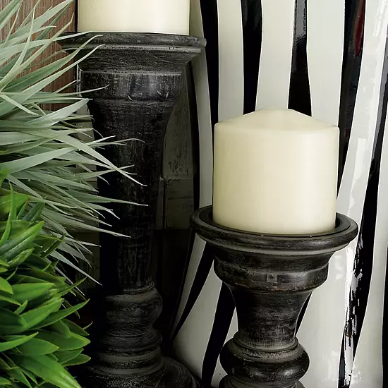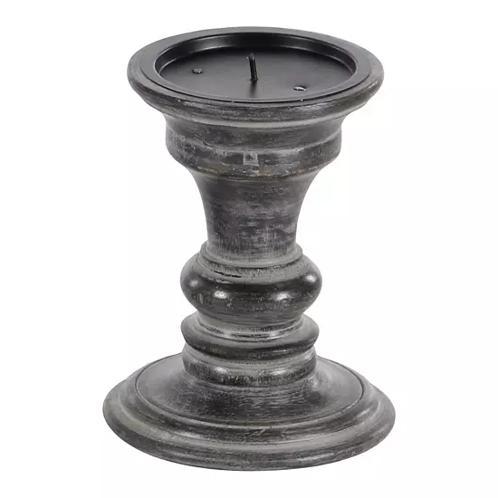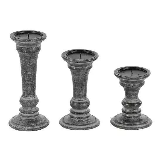 - The versatile, rich gray tone over the solid mango wood candlesticks will integrate into any traditional home’s color palette, while the turned column silhouettes add a sophisticated antique touch