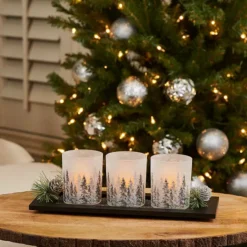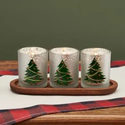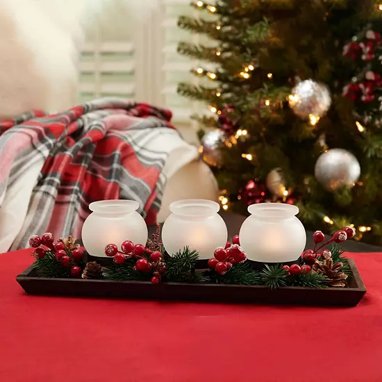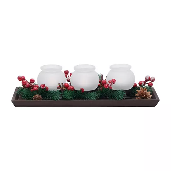 - Includes: wood tray, 3 glass votives, 3 LED tealights, holiday berries and greenery